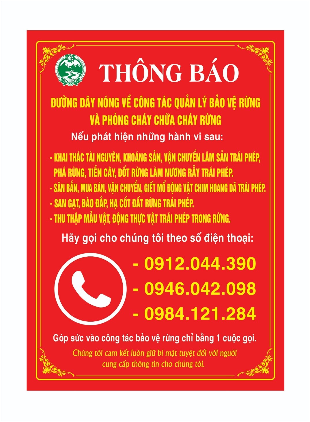 Việc thiết lập đường dây nóng sẽ kịp thời tiếp nhận những thông tin phản ánh, kiến nghị của các cá nhân, tổ chức, quần chúng nhân dân đối với các hành vi vi phạm về quản lý bảo vệ, phòng cháy chữa cháy rừng như: Khai thác tài nguyên, khoáng sản, vận chuyển lâm sản trái phép, phá rừng, tiễn cây, đốt rừng làm nương rẫy; săn bắt, mua bán, vận chuyển, giết mổ động vật hoang dã; san gạt, đào đắp, hạ cốt nền đất rừng; thu thập mẫu vật động, thực vật rừng trái phép trong rừng… từ đó mọi thông tin được người dân thông báo sẽ được lực lượng chức năng xử lý nghiêm minh, công khai, kịp thời, tiến hành ngăn chặn các hành vi vi phạm theo đúng pháp luật.
