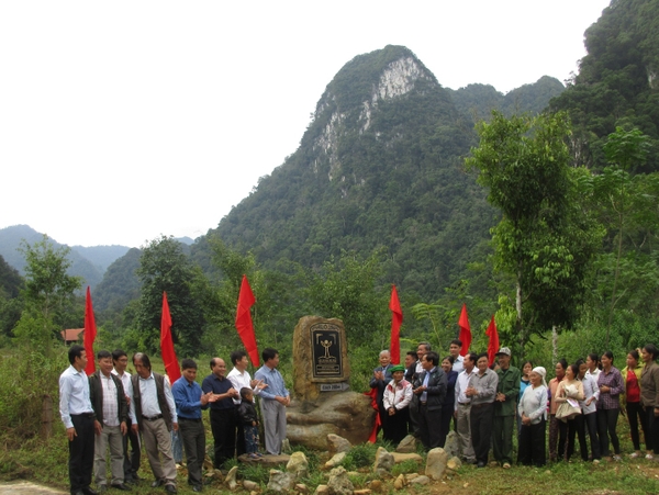 GS.TSKH: Đặng Huy Huỳnh - Chủ tịch Hội di sản Việt Nam (thứ chín từ trái sang) cùng các đồng chí lãnh đạo Sở NN&PTNT Phú Thọ, UBND huyện Tân Sơn làm lễ mở bia cây di sản cho quần thể 20 cây nghiến cổ thụ tại VQG Xuân Sơn